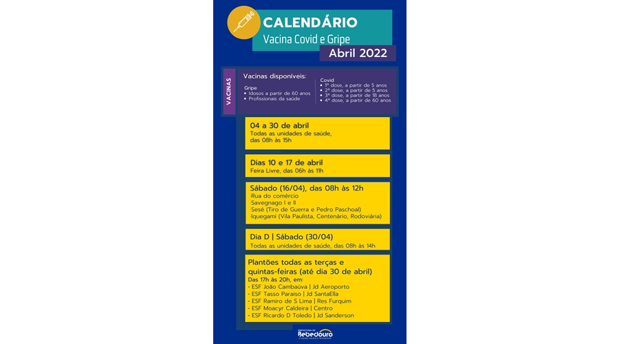 A Secretaria Municipal de Saúde ampliou a vacinação de todas as pessoas a partir de 05 anos contra a Covid-19 e as de 60 anos ou + contra Gripe e Covid-19 durante o feriado de cristão Paixão de Cristo.