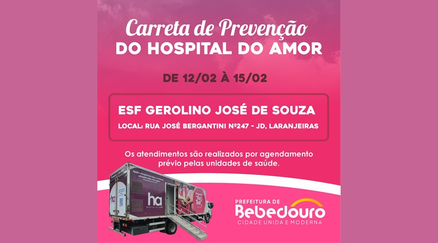 A Carreta do Hospital de Amor de Barretos está realizando os exames de prevenção ao câncer, entre os dias 12 a 15 de fevereiro, em frente a Estratégia de Saúde da Família (ESF) Dr. Gerolino José De Souza, localizada no jardim Laranjeiras.