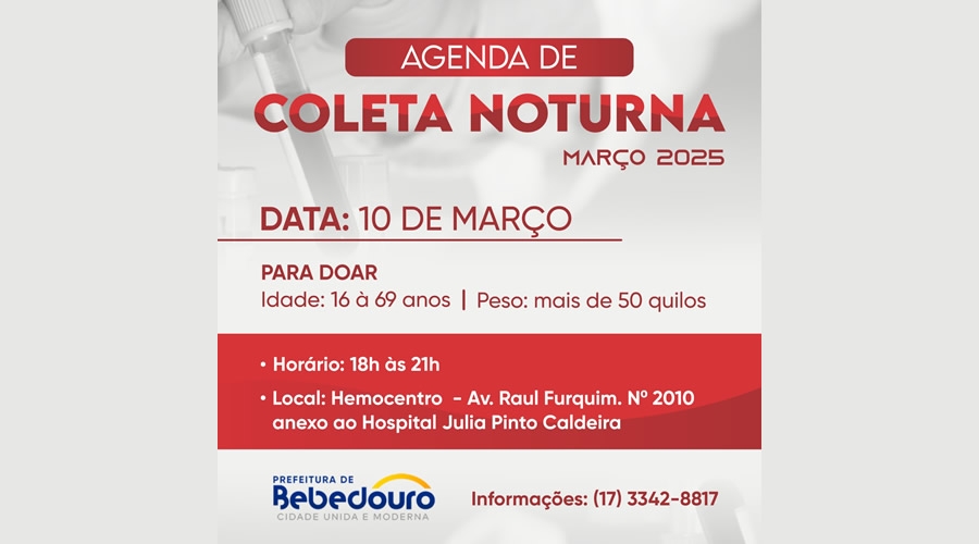 O Hemocentro de Bebedouro, realizará na segunda-feira (10/03), a coleta noturna do mês março, que acontecerá das 18h às 21 horas.