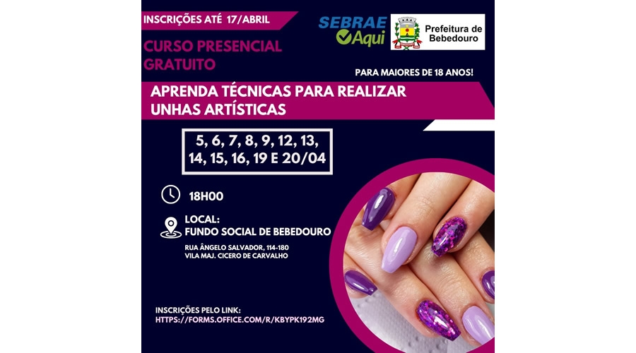 A Prefeitura de Bebedouro, através do Fundo Social, em parceria com o SEBRAE Aqui, abre as inscrições para o curso, "Técnicas para realizar unhas artísticas", que acontecerá presencialmente, nos dias 05, 06, 07, 08, 09, 12, 13, 14, 15, 16, 19 e 20 de abril, às 18 horas, no Fundo Social, localizado na rua Ângelo Salvador, 114.