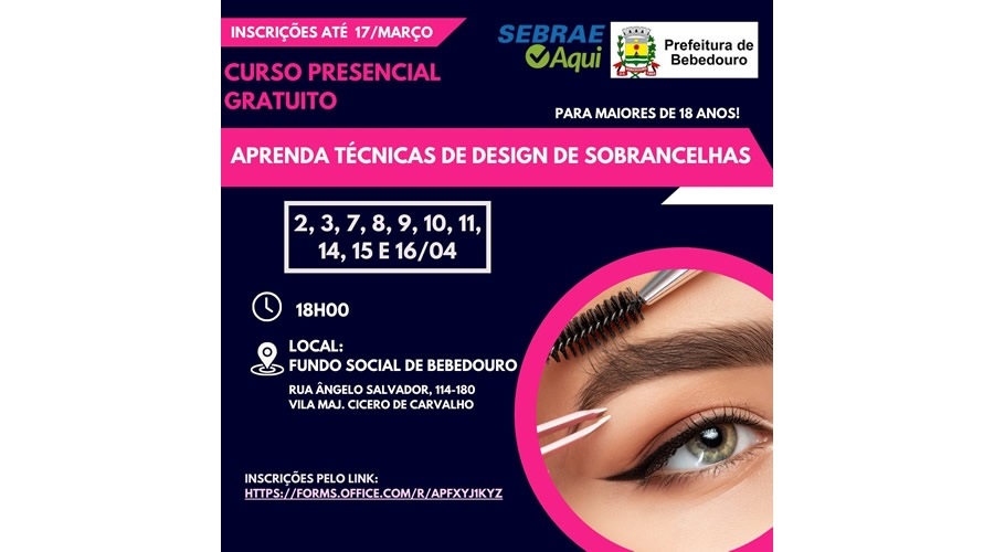 A Prefeitura de Bebedouro, através do Fundo Social, em parceria com o SEBRAE Aqui, abre as inscrições para o curso, "Técnicas de Design de Sobrancelhas", que acontecerá presencialmente, nos dias 02, 03, 07, 08, 09, 10, 11, 14, 15, 16 de abril, às 18 horas, no Fundo Social, localizado na rua Angelo Salvador, 114.