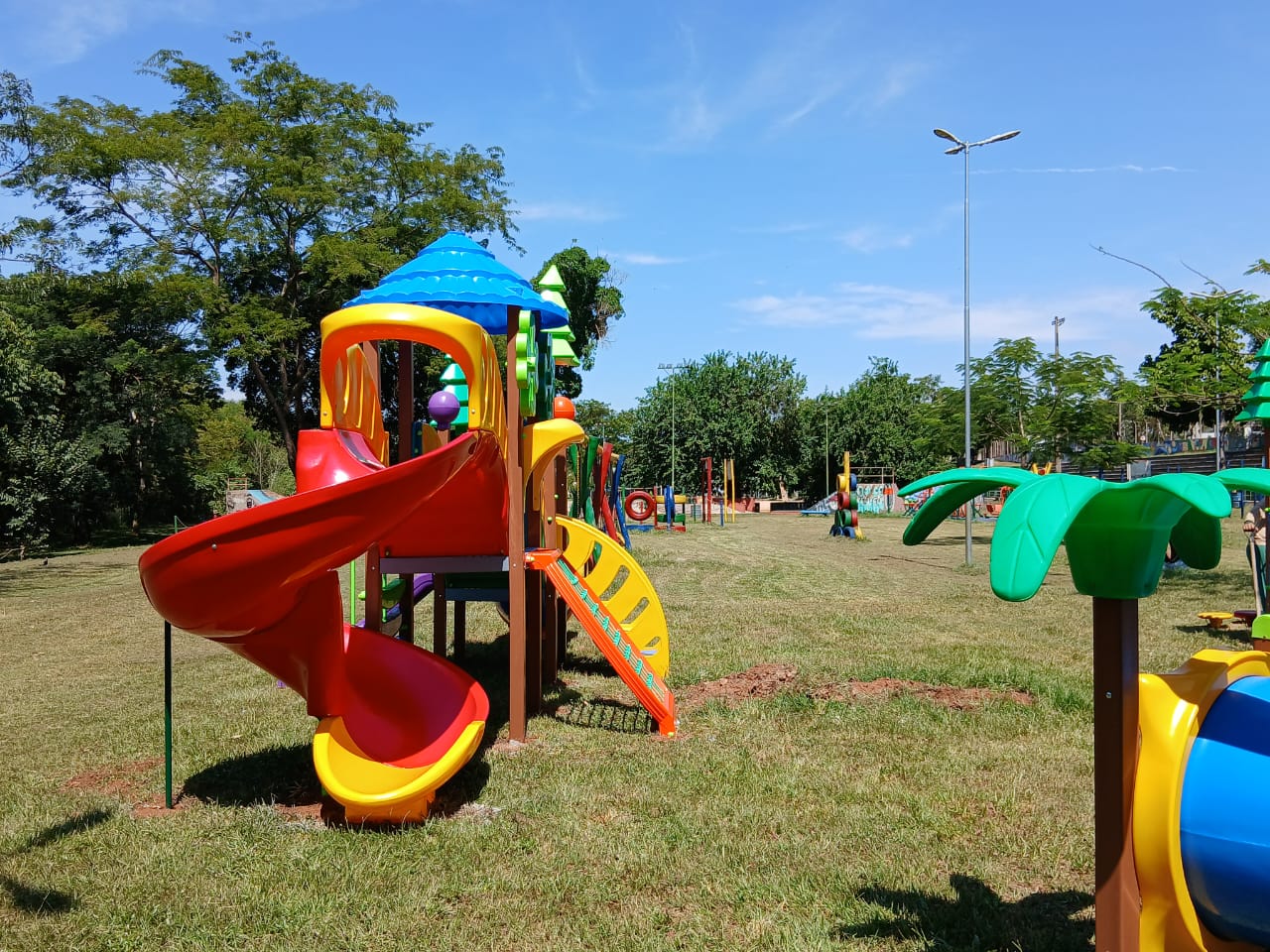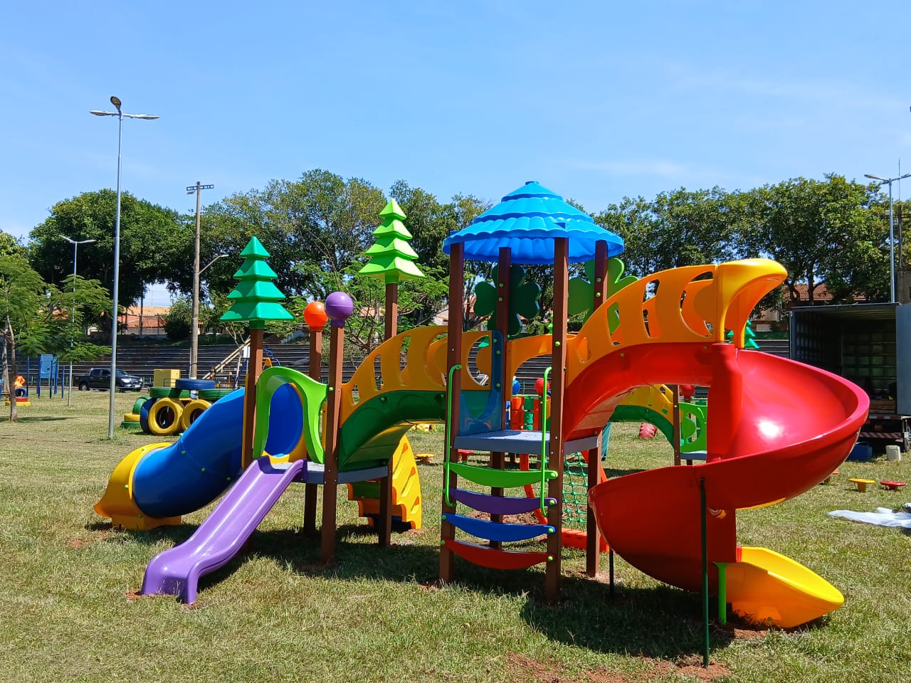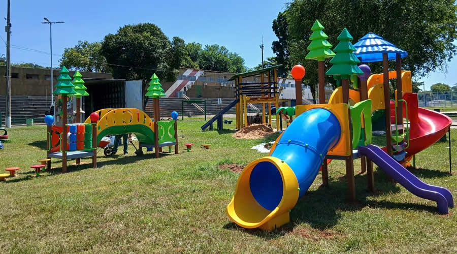 O novo equipamento conta com três módulos, incluindo escorregador, escadinha e casinha elevada, garantindo um ambiente lúdico e seguro para as crianças.