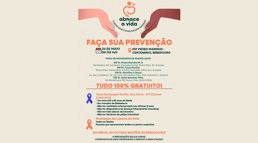 A Prefeitura de Bebedouro, por meio da campanha “Abrace a Vida – Cuidar hoje é viver melhor amanhã”, promove uma ação de prevenção à saúde no sábado, 24 de maio, das 9h às 14h, na ESF Dr. Pedro Marinho Jr, no jardim Centenário.