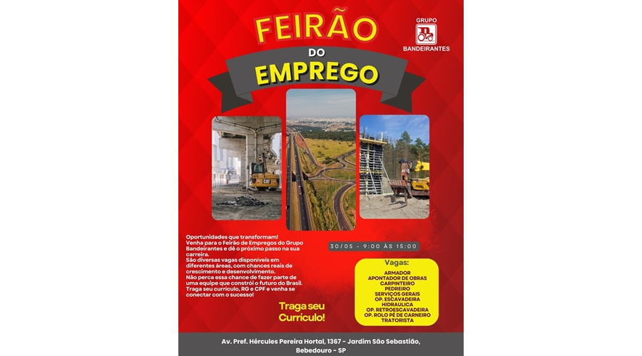 A Prefeitura de Bebedouro, por meio do Posto de Atendimento ao Trabalhador (PAT), em parceria com o Grupo Bandeirantes, realiza nesta sexta-feira, 30 de maio, o Feirão de Vagas de Emprego voltado à construção civil.