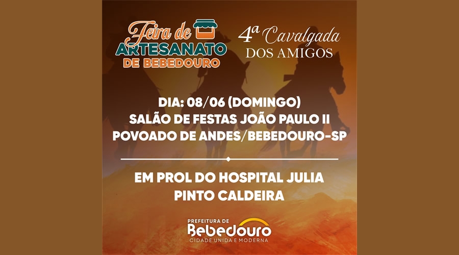 A Prefeitura de Bebedouro, através do Departamento de Turismo, realizará a Feira de Artesanato de Bebedouro, na 4ª Cavalgada dos Amigos, no povoado de Andes.