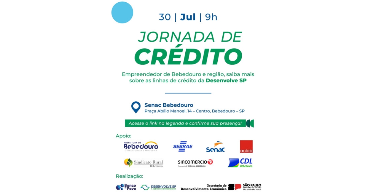 A Prefeitura de Bebedouro, em parceria com a Desenvolve SP, o Banco do Povo Paulista e instituições de apoio ao empreendedorismo, realizará no dia 30 de julho (terça-feira), às 9 horas, a Jornada de Crédito 2025, no Senac Bebedouro, localizado na Praça Abílio Manoel, 14, Centro.