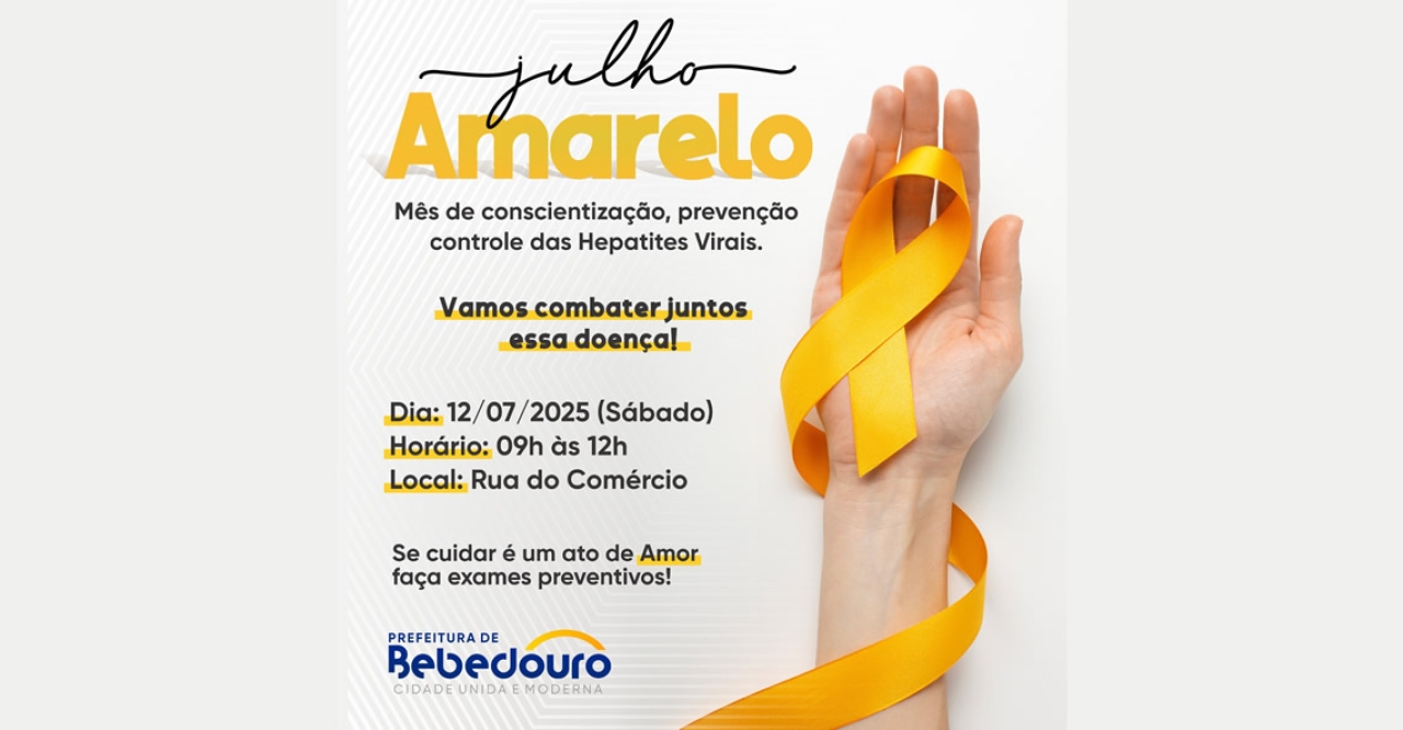 A Prefeitura de Bebedouro, através da Secretaria de Saúde (SMS), por meio da Vigilância Epidemiológica, realizará no sábado (12/07), das 9 às 12 horas, nas ruas do comércio local, uma ação da campanha, Julho Amarelo, mês dedicado à conscientização, prevenção e controle das hepatites virais.