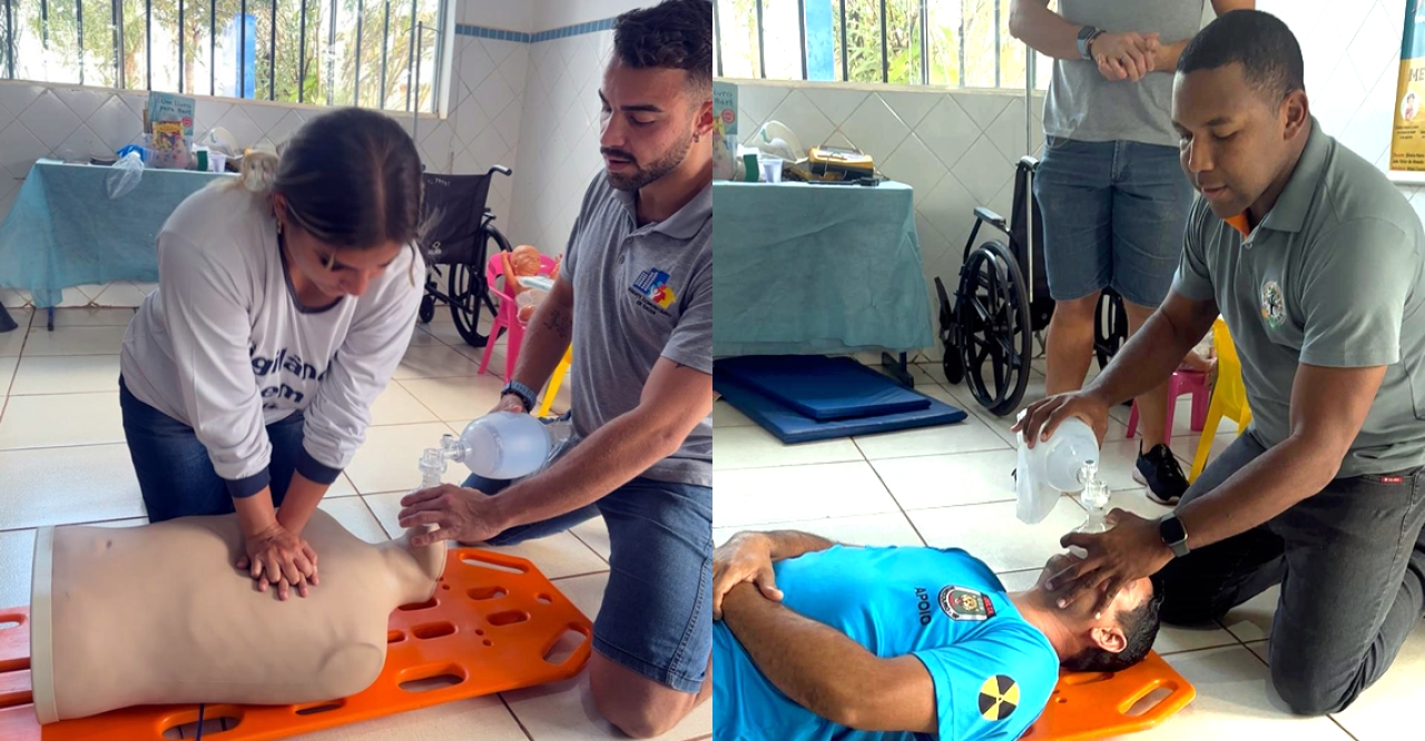 A capacitação abordou técnicas de reanimação cardiopulmonar (RCP), manobra de desengasgo em adultos, crianças e bebês, além de simulações de atendimento em casos de acidentes e traumas.