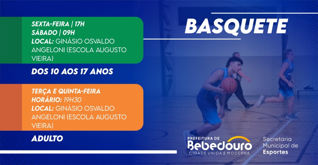 A Prefeitura de Bebedouro, por meio da Secretaria Municipal de Esportes (SME), oferece gratuitamente aulas de Basquete, uma modalidade que estimula a prática esportiva, o trabalho em equipe.