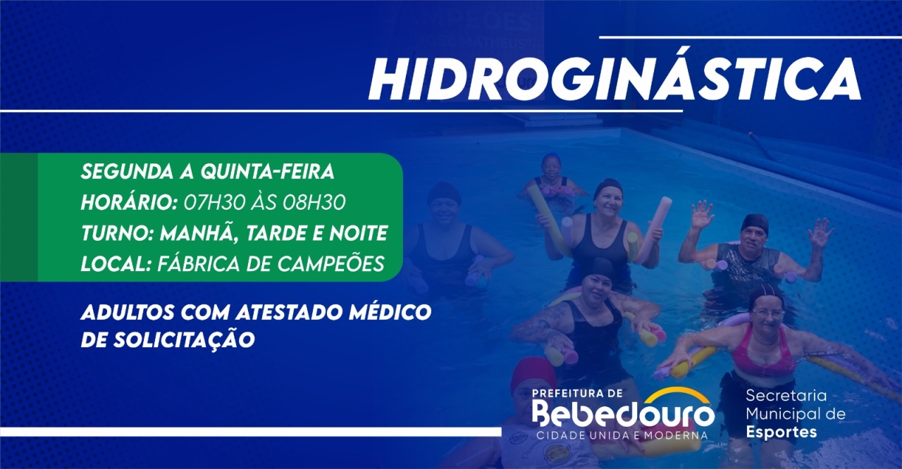A Prefeitura de Bebedouro, através da Secretaria Municipal de Esportes (SME), oferece gratuitamente aulas de Hidroginástica, uma modalidade que une atividade física e bem-estar. Indicada para adultos, a prática é reconhecida por seus benefícios, como melhora da capacidade cardiorrespiratória, fortalecimento muscular, aumento da flexibilidade e baixo impacto nas articulações.