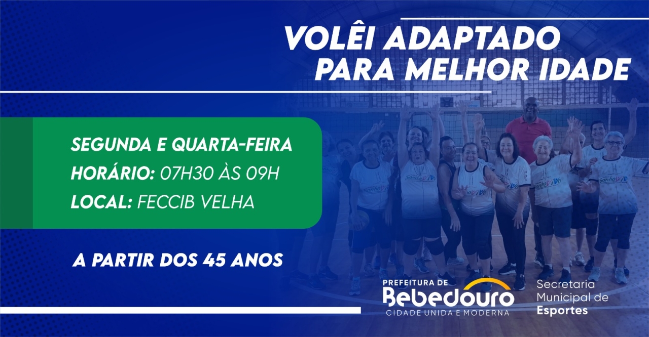 A Prefeitura de Bebedouro, por meio da Secretaria Municipal de Esportes (SME), oferece gratuitamente o Voleibol Adaptado para a Melhor Idade, voltada para quem tem acima de 45 anos.