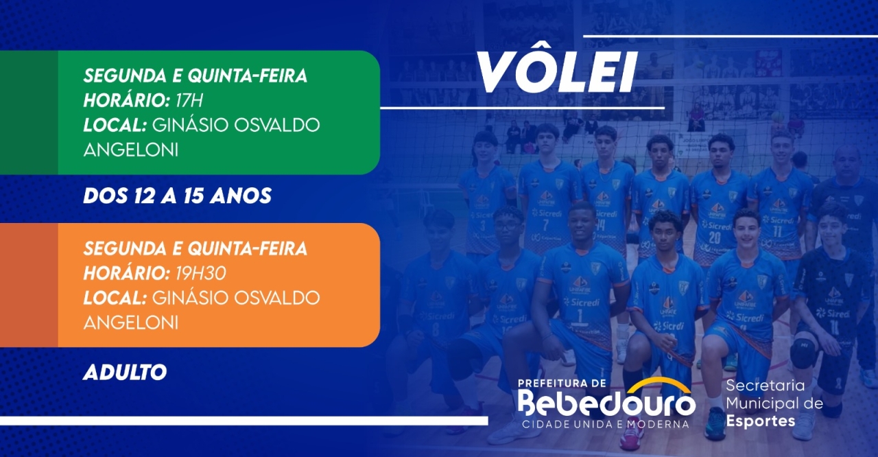 A Prefeitura de Bebedouro, por meio da Secretaria Municipal de Esportes (SME), oferece gratuitamente aulas de Vôlei, com turmas para jovens e adultos.