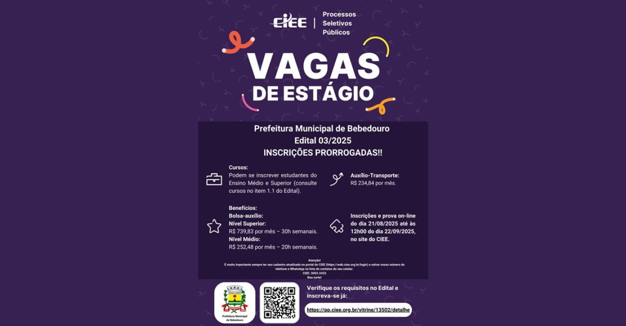 A Prefeitura de Bebedouro, em parceria com o CIEE (Centro de Integração Empresa-Escola), prorrogou até o dia 22 de setembro, ao meio-dia, o prazo de inscrições para o processo seletivo de estágio. Podem participar estudantes regularmente matriculados no Ensino Médio ou no Ensino Superior, em cursos específicos.