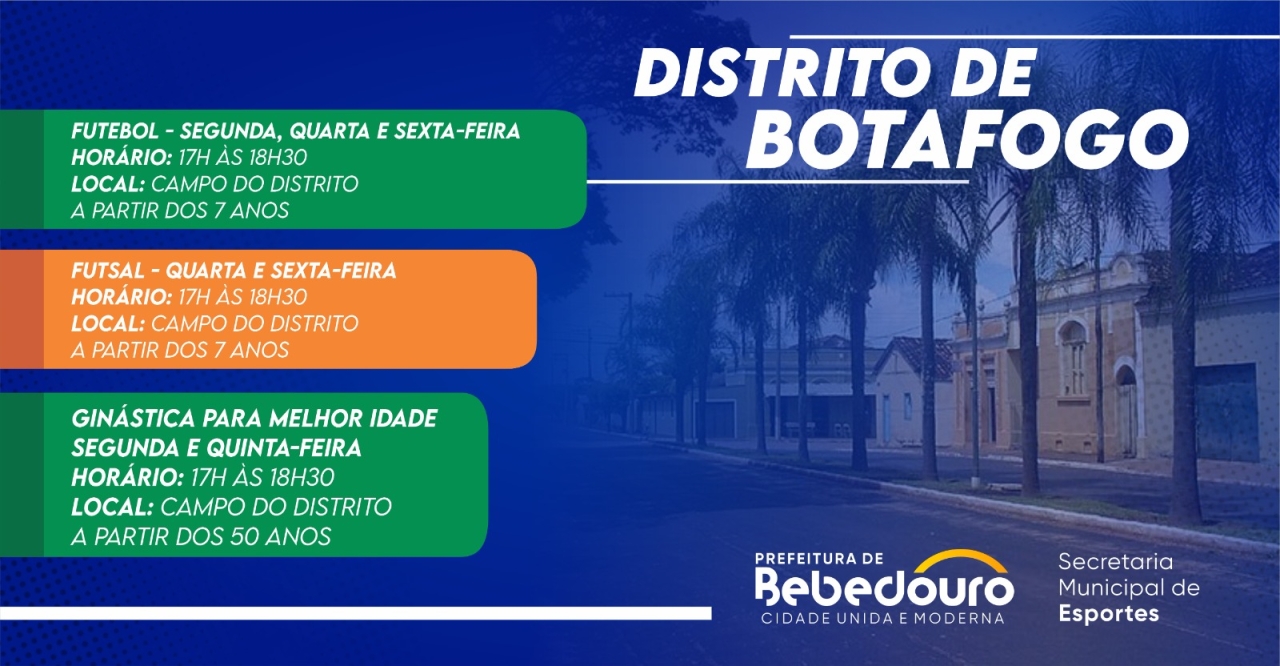 A Prefeitura de Bebedouro, através da Secretaria Municipal de Esportes (SME), oferece gratuitamente atividades esportivas para os moradores do Distrito de Botafogo, atendendo diferentes faixas etárias e incentivando a prática de atividades físicas como forma de saúde, lazer e integração social.