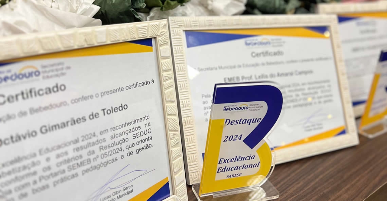 A cerimônia também foi marcada pela entrega do Prêmio Excelência Educacional 2024, um reconhecimento às quatro escolas municipais que alcançaram os critérios estabelecidos pelo SARESP e pelos indicadores de alfabetização. Foram homenageadas, EMEB Dr. Augusto Vieira, EMEB Coronel Conrado Caldeira, EMEB Lellis do Amaral Campos, e EMEB Octávio Guimarães de Toledo.