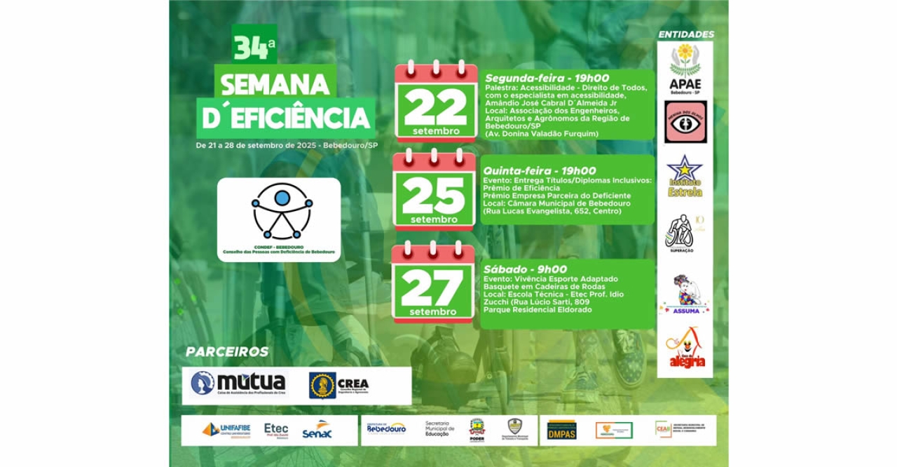 A Prefeitura de Bebedouro, em parceria com o Conselho das Pessoas com Deficiência (CONDEF), realiza de 21 a 28 de setembro, a 34ª Semana D'Eficiência, evento tradicional que promove a inclusão, a conscientização e o fortalecimento dos direitos da pessoa com deficiência.