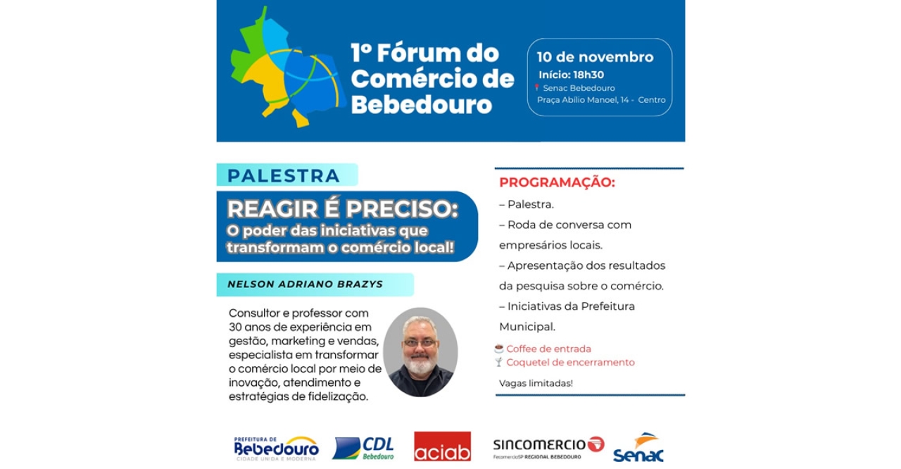 A Prefeitura de Bebedouro, em parceria com o Senac, ACIAB, Sincomércio e CDL, convida toda a população para participar do I Fórum do Comércio de Bebedouro, um encontro exclusivo voltado ao diálogo, à troca de ideias e à construção de novas oportunidades para o fortalecimento do comércio local.