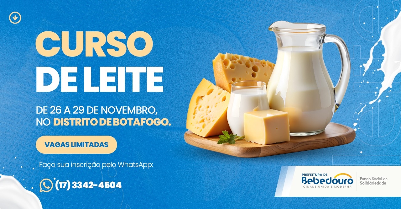 O Fundo Social de Solidariedade, está com inscrições abertas para o Curso de Leite, que acontecerá de 26 a 29 de novembro, no Distrito de Botafogo.