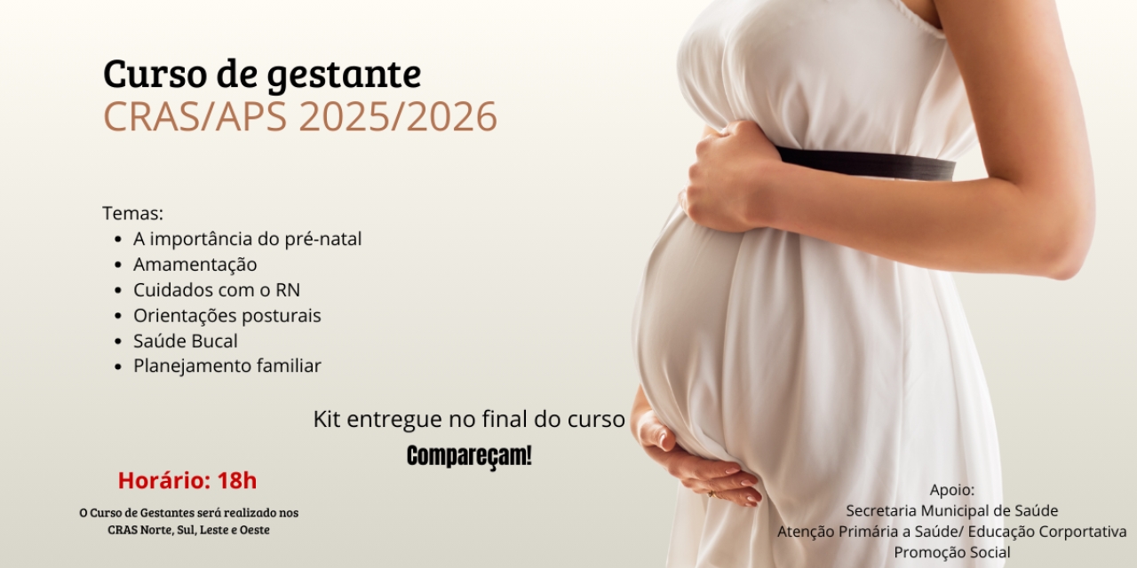A Prefeitura Municipal de Bebedouro, por meio da Secretaria Municipal de Desenvolvimento Social e Cidadania, em parceria com a Secretaria Municipal de Saúde, através da Atenção Primária à Saúde e da Educação Corporativa, dará início ao Curso de Gestantes, que será realizado nos CRAS Norte, Sul, Leste e Oeste.