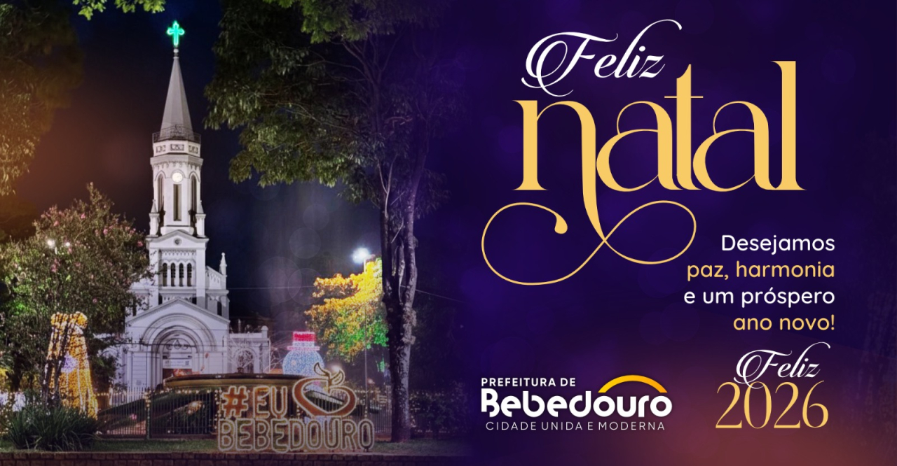 Neste Natal, a Prefeitura de Bebedouro deseja que cada lar seja iluminado pela esperança, pela união e pelo amor ao próximo. Que o espírito natalino renove a fé, fortaleça os laços familiares e traga paz, saúde e solidariedade a todos os bebedourenses.