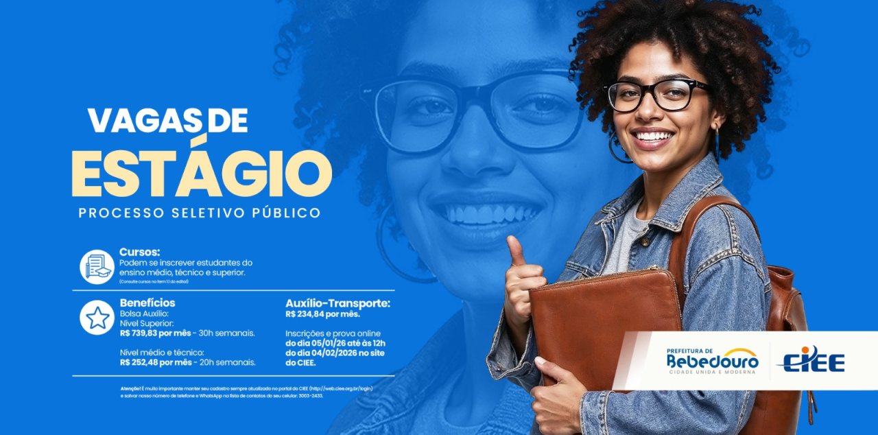 A Prefeitura de Bebedouro, inicia o ano de 2026 com a abertura do Processo Seletivo Público para preenchimento de vagas de estágio, conforme o Edital nº 01/2026, em parceria com o Centro de Integração Empresa-Escola (CIEE).