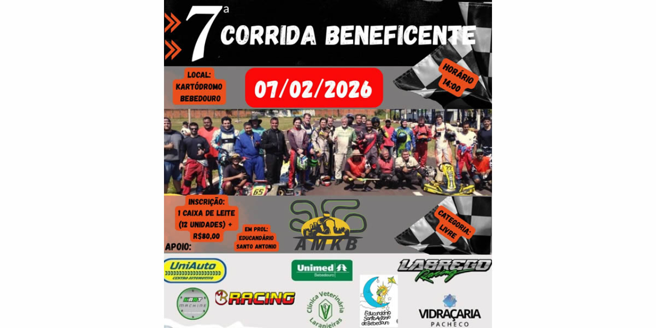 A 7ª Corrida Beneficente será realizada no próximo sábado, dia 07 de fevereiro de 2026, a partir das 14h, no Kartódromo de Bebedouro. O evento esportivo tem caráter solidário e reunirá pilotos e apaixonados pelo automobilismo em uma grande ação de confraternização e ajuda ao próximo.
