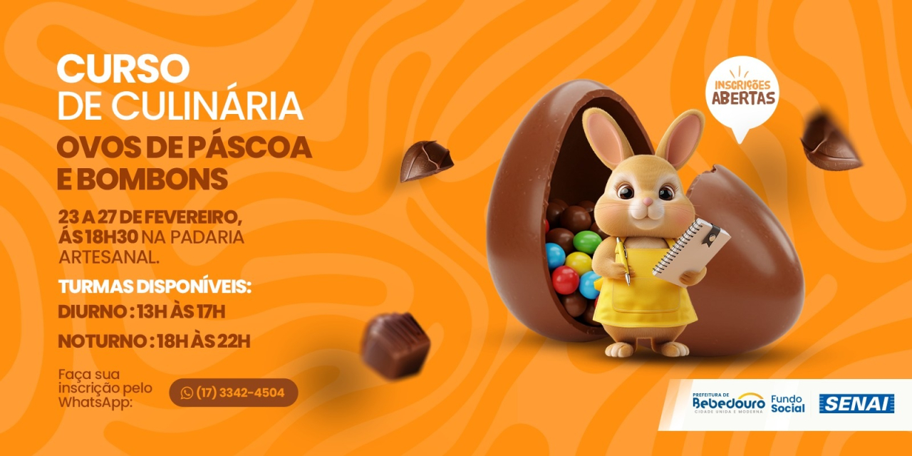 A Prefeitura de Bebedouro, por meio do Fundo Social de Solidariedade, promove o Curso de Culinária – Ovos de Páscoa e Bombons, que será realizado na Padaria Artesanal, oferecendo uma oportunidade de aprendizado, qualificação profissional e geração de renda.