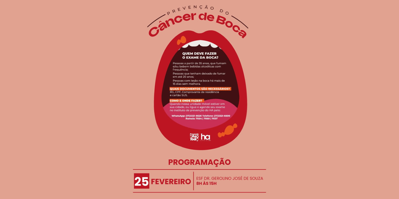 A Prefeitura de Bebedouro, através da Secretaria Municipal de Saúde (SMS), em parceria com o Hospital de Amor, informa que a Carreta Odontológica estará nesta quarta-feira, dia 25 de fevereiro, na ESF Dr. Gerolino José de Souza, no bairro Laranjeiras, como parte da Campanha de Prevenção ao Câncer Bucal 2026.