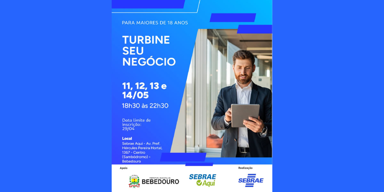 A Prefeitura de Bebedouro, através da Secretaria Municipal de Desenvolvimento Econômico, em parceria com o Sebrae Aqui Bebedouro, convida empreendedores do município para participarem do curso “Turbine seu Negócio”, uma oportunidade de capacitação prática voltada ao fortalecimento e crescimento das empresas locais.