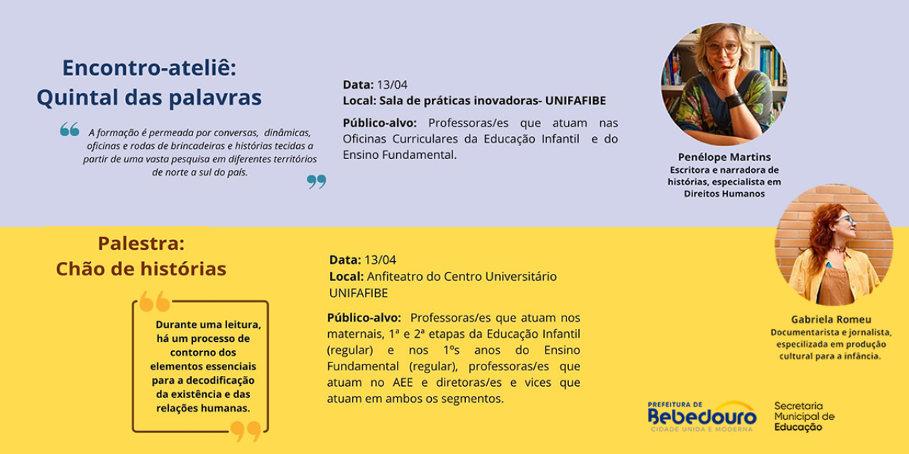 A Prefeitura de Bebedouro, por meio da Secretaria Municipal de Educação, promove no dia 13 de abril, na UNIFAFIBE, a Formação de Professores das Oficinas Curriculares, das 13h às 17h, com o tema “Quintal das Palavras”, conduzida pelas autoras Gabriela Romeu e Penélope Martins.