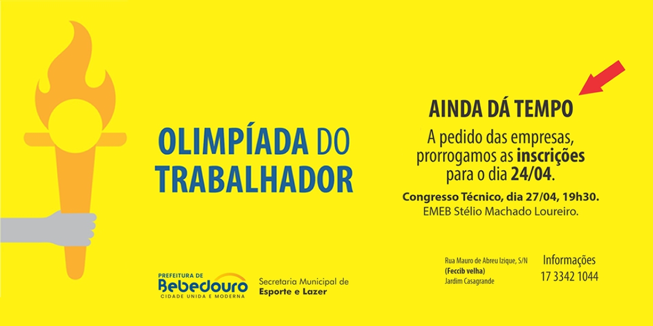 A Prefeitura de Bebedouro, por meio da Secretaria Municipal de Esporte e Lazer, tem as inscrições prorrogadas para a Olimpíada do Trabalhador.