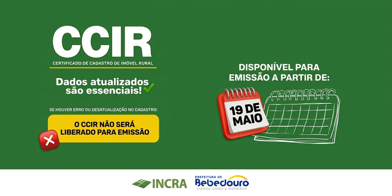 A Prefeitura de Bebedouro, através da Unidade de Cadastro Incra de Bebedouro, informa que o Certificado de Cadastro de Imóvel Rural (CCIR) para o exercício de 2026, estará disponível para emissão, a partir do dia 19 de Maio.