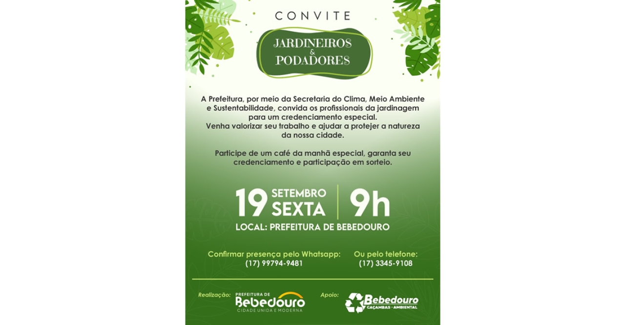 A Prefeitura de Bebedouro, através da Secretaria do Clima, Meio Ambiente e Sustentabilidade, convida todos os jardineiros e podadores do município, para participarem de um evento especial de credenciamento, que acontecerá na sexta-feira (19/09), às 9h, na Prefeitura Municipal.