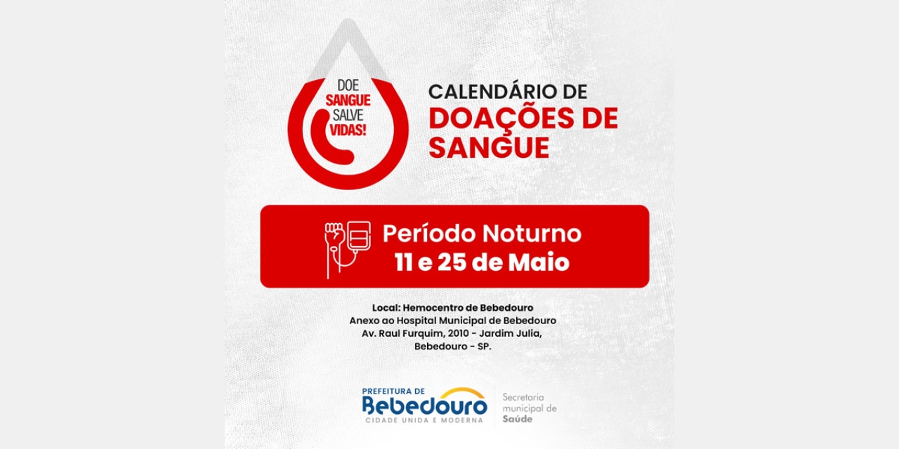 A Prefeitura de Bebedouro, através da Secretaria Municipal de Saúde (SMS), divulga o calendário de maio das doações de sangue em período noturno.