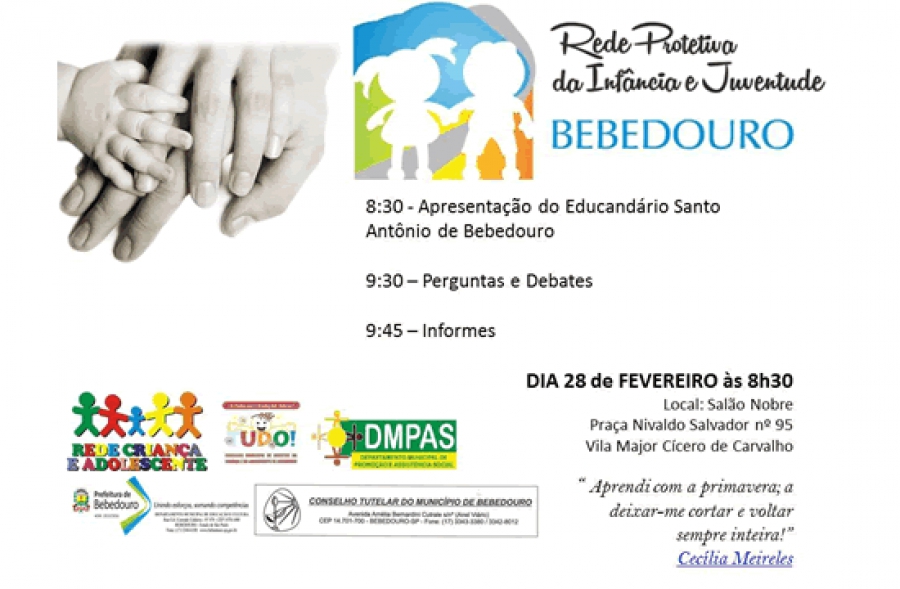 Acontece na sexta-feira (28), às 8H30, a primeira reunião do ano de 2014 da Rede Protetiva da Infância e da Juventude, no Salão Nobre da Praça Nivaldo Salvador, n° 95 na Vila Major Cícero de Carvalho.