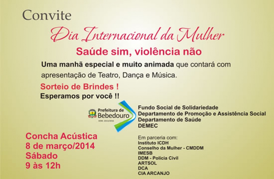 A Prefeitura Municipal de Bebedouro, por meio do Fundo Social de Solidariedade, Departamento de Promoção e Assistência Social, Departamento de Saúde e DEMEC realizam em parceria com o Instituto ICDH, Conselho da Mulher, IMESB, Polícia Civil, ARTSOL, DCA e CIA Arcanjo, a celebração do Dia Internacional da Mulher.
