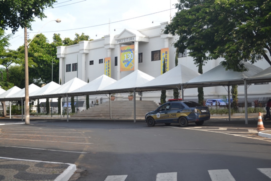 Começaram a ser instaladas, em frente da Prefeitura, as tendas onde será montado o bolo em comemoração aos 130 anos de Bebedouro. Devido ao tamanho recorde e ao número de funcionários municipais envolvidos na confecção e montagem, foi necessária a interdição provisória da rua em frente ao paço. Os motoristas podem usar as vias atrás do prédio, especialmente nesta sexta e sábado.