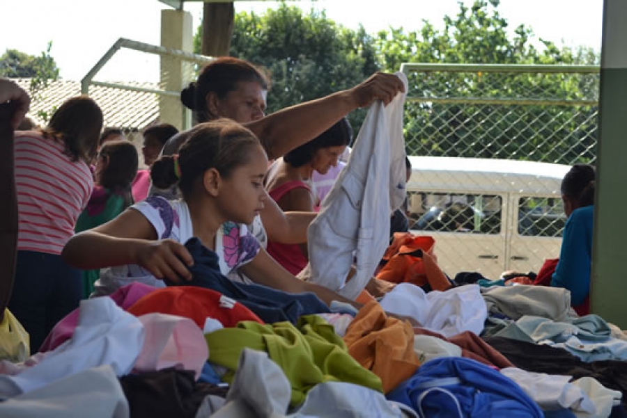 Roupas, sapatos e cobertores arrecadados foram dispostos em mesas no Cemei Profª Giselda Baenninger, popularmente conhecida como Creche da Xuxa, e cada um dos interessados pôde escolher de acordo com sua necessidade.