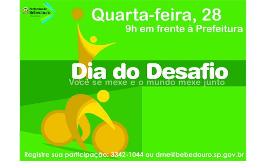 O Dia do Desafio, promovido no Brasil pelo Sesc, é realizado em várias partes do mundo com o objetivo de incentivar a prática esportiva. As pessoas ou grupos que fizerem ao menos 15 minutos de atividade física deverão comunicar ao Departamento de Esportes pelo telefone 3342-1044 ou pelo e-mail Este endereço de email está sendo protegido de spambots. Você precisa do JavaScript ativado para vê-lo..