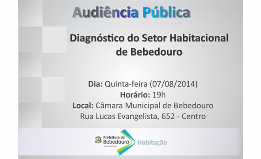 A Prefeitura de Bebedouro, por meio do Departamento de Habitação, promoverá uma audiência pública para apresentar o diagnóstico habitacional de Bebedouro, na quinta-feira (07/08), a partir das 19 horas, na Câmara de Bebedouro.