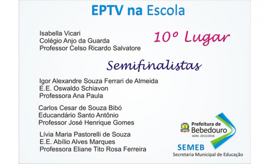 A EPTV divulgou a lista com os nomes dos 10 finalistas participantes da edição 2014 do EPTV na Escola. O projeto realizado há mais de 15 anos, selecionou entre as 38 cidades participantes as 10 melhores redações sobre o tema “Como construir o mundo que queremos?”.