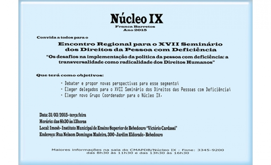 Durante o encontro serão desenvolvidos e debatidos temas como gênero, raça e etnia, diversidade sexual e geracional, órgãos gestores e Instâncias de Participação Social, a interação entre os poderes e os entes federados. Para cada eixo haverá um especialista que coordenará o grupo. Acontecerá também uma eleição para Delegados que representarão o Núcleo IX, instalado em Bebedouro. A função de Delegado é encaminhar e votar as nossas propostas ao Seminário Estadual que posteriormente serão encaminhadas para a Conferência Nacional dos Direitos Humanos. Estes Delegados também concorrerão aos cargos de conselheiros estaduais no Conselho Estadual para Assuntos da Pessoa com Deficiência (CEAPcD).