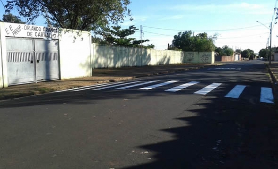 Foram realizados serviços de repinturas de faixas de pedestres, sinalização - PARE e DEVAGAR, e ainda rampas para cadeirantes.