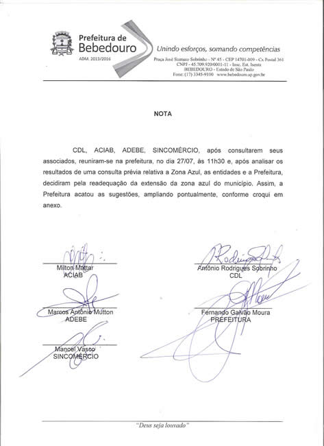 A Prefeitura Municipal se reuniu, mais uma vez, com os representantes do comércio de Bebedouro, nesta segunda-feira (27), na prefeitura. CDL, ACIAB, ADEBE, SINCOMÉRCIO e Prefeitura*, decidiram, em conjunto, a readequação da zona azul na área central.