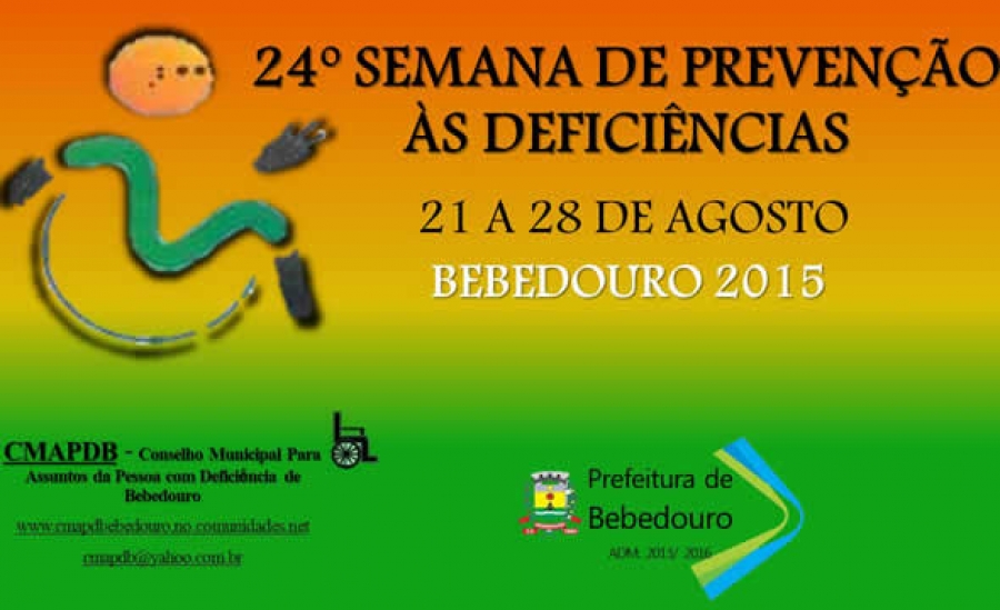 O CMAPDB (Conselho Municipal para Assuntos da Pessoa com Deficiência de Bebedouro), em parceria com a Prefeitura Municipal - Coordenadoria de Executiva da Acessibilidade, realiza a 24ª Semana de Prevenção às Deficiências de Bebedouro, de 21 a 28 de agosto.