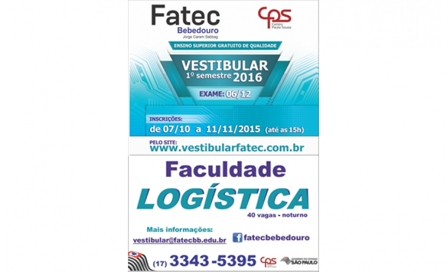 A Fatec Jorge Caram Sabbag - Bebedouro, possui 40 vagas para o curso de nível superior em Tecnologia em Logística, para o período noturno. A isenção ou redução da taxa será liberada para candidatos socioeconomicamente carentes e que preencham, cumulativamente, diversos requisitos.