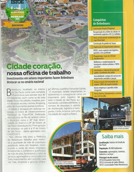 “Queremos ajudar o Brasil a conhecer as experiências que estão dando certo, para que possam ser replicadas em todo o País”, diz Caco Azulgaray, responsável pela publicação da Revista Istoé. "Bebedouro se destacou entre as melhores cidades do Brasil em diversos indicadores e o ranking vai mostrar o município para todo país, atraindo mais investimentos e negócios", completou Mauricio Arbex, diretor da Revista.