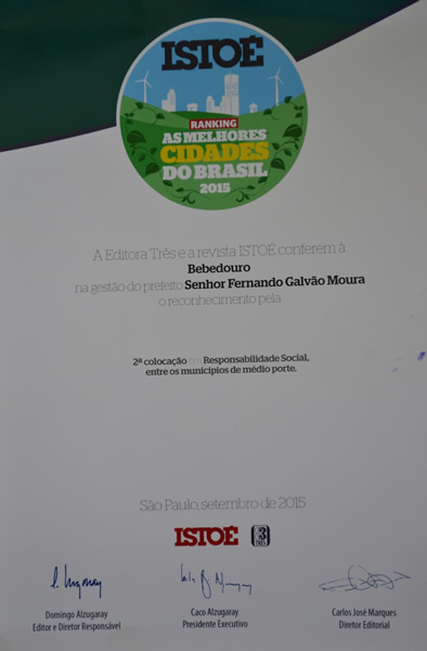 Metodologia - O estudo inédito, fruto de parceria da IstoÉ e da Austin Ranting, considerou a evolução de 212 indicadores, em análises quantitativas e qualitativas, em 5.565 cidades brasileiras, classificadas por portes - pequeno (até 50 mil habitantes), médio (50 mil a 200 mil habitantes) e grande (acima de 200 mil habitantes). Bebedouro conquistou a 2ª colocação entre as cidades de seu porte, em indicadores de responsabilidade social.