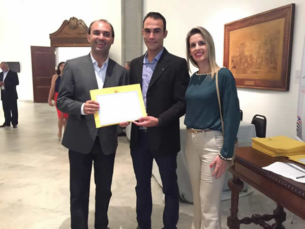 O prefeito Fernando Galvão, acompanhado da Secretaria de Educação, Ana Silvia Bergantini Miguel e do idealizador do projetor, professor Murillo Montemor, receberam a premiação ente os dez projetos mais inovadores do Estado.