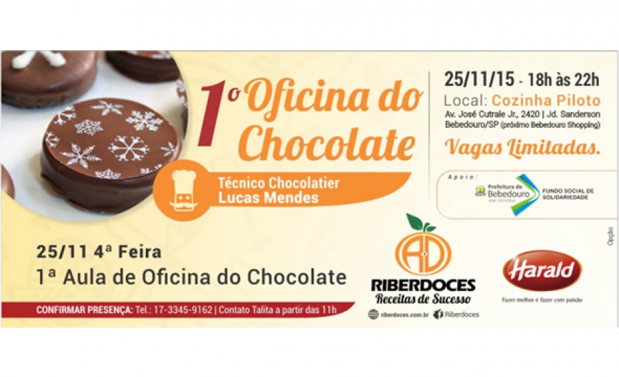 A 1ª Oficina do Chocolate será comandada pelo chocolatier, Lucas Mendes, na quinta-feira (25). A oficina é uma ótima oportunidade para se atualizar e conhecer novas técnicas desta delicia da culinária internacional.